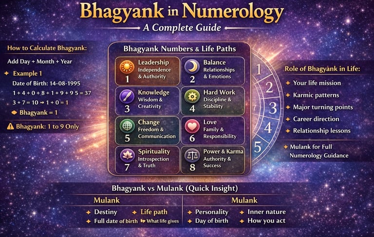 Bhagyank is also known as the Life Path Number. It reflects your life purpose, karmic lessons, and long-term growth.